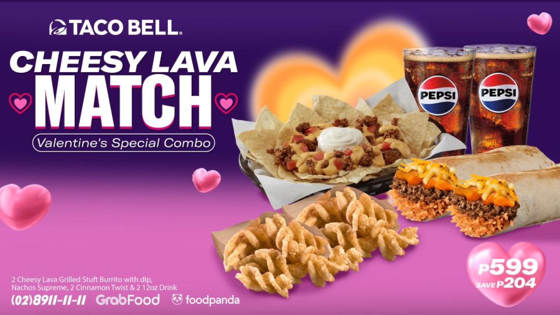 Celebrate love with Taco Bell’s Cheesy Lava Match, available for a limited time only! It comes with 2 Cheesy Lava Grilled Stuft Burritos w/ dip, 1 Nachos Supreme, 2 servings of Cinamon Twists, and two 12-oz servings of ice-cold soda, all for just P599! That’s a total of P204 in savings!