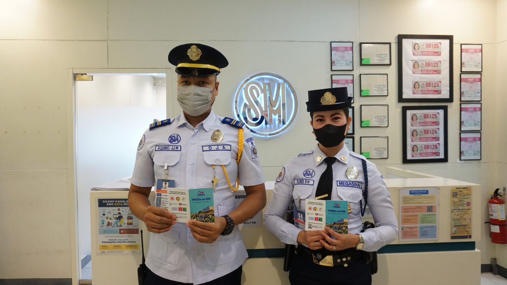 SM Mall of Asia (MOA) security personnel Jay Jess Aquino and Rebecca Flores pose with their sensitivity training manuals on how to care for patrons with different needs.