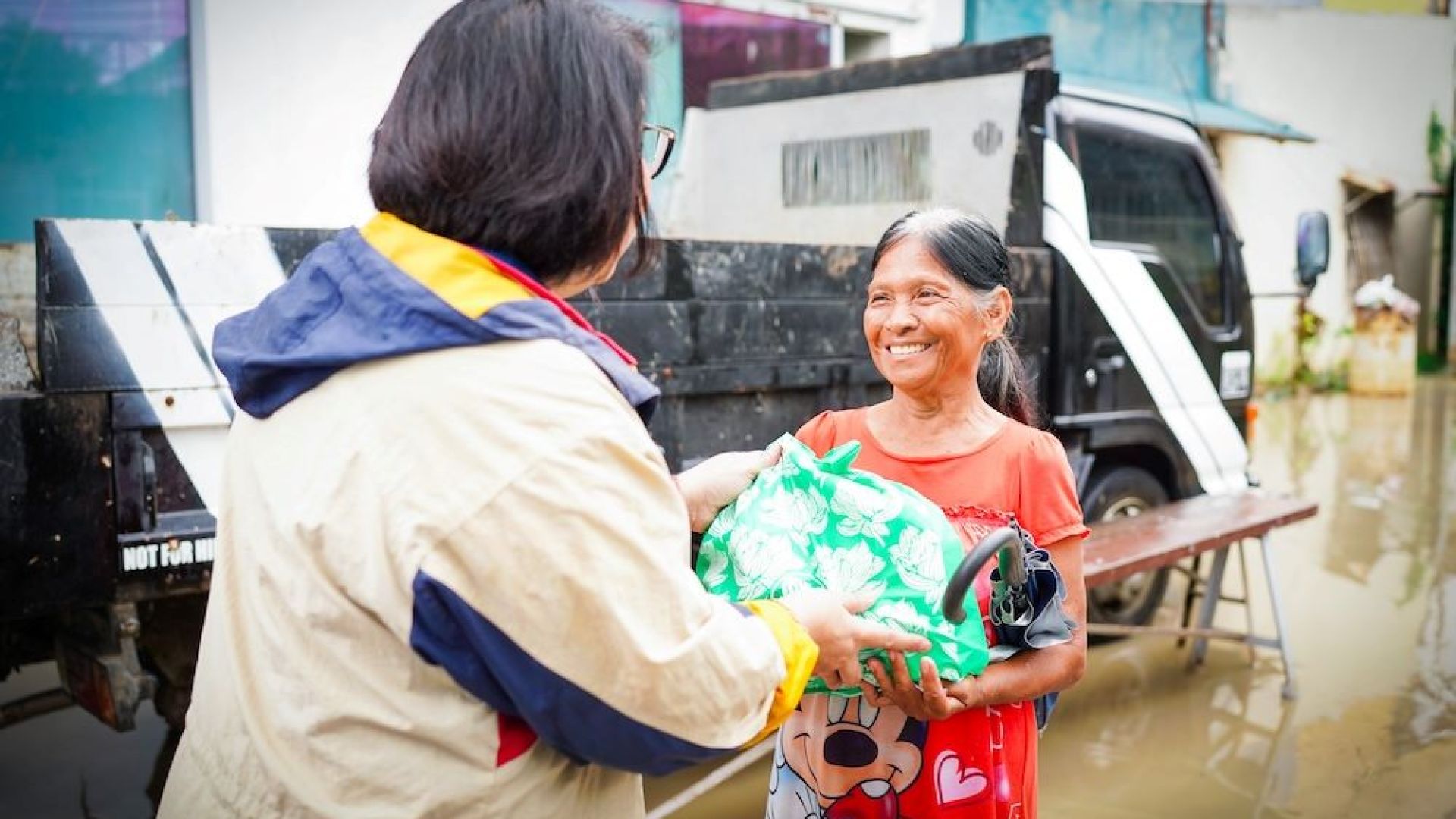 SM Supermalls Regional Operations Head for Bulacan and CAMANAVA, Ana Datu, an SM employee-volunteer, delivers immediate relief to a resident impacted by flooding.