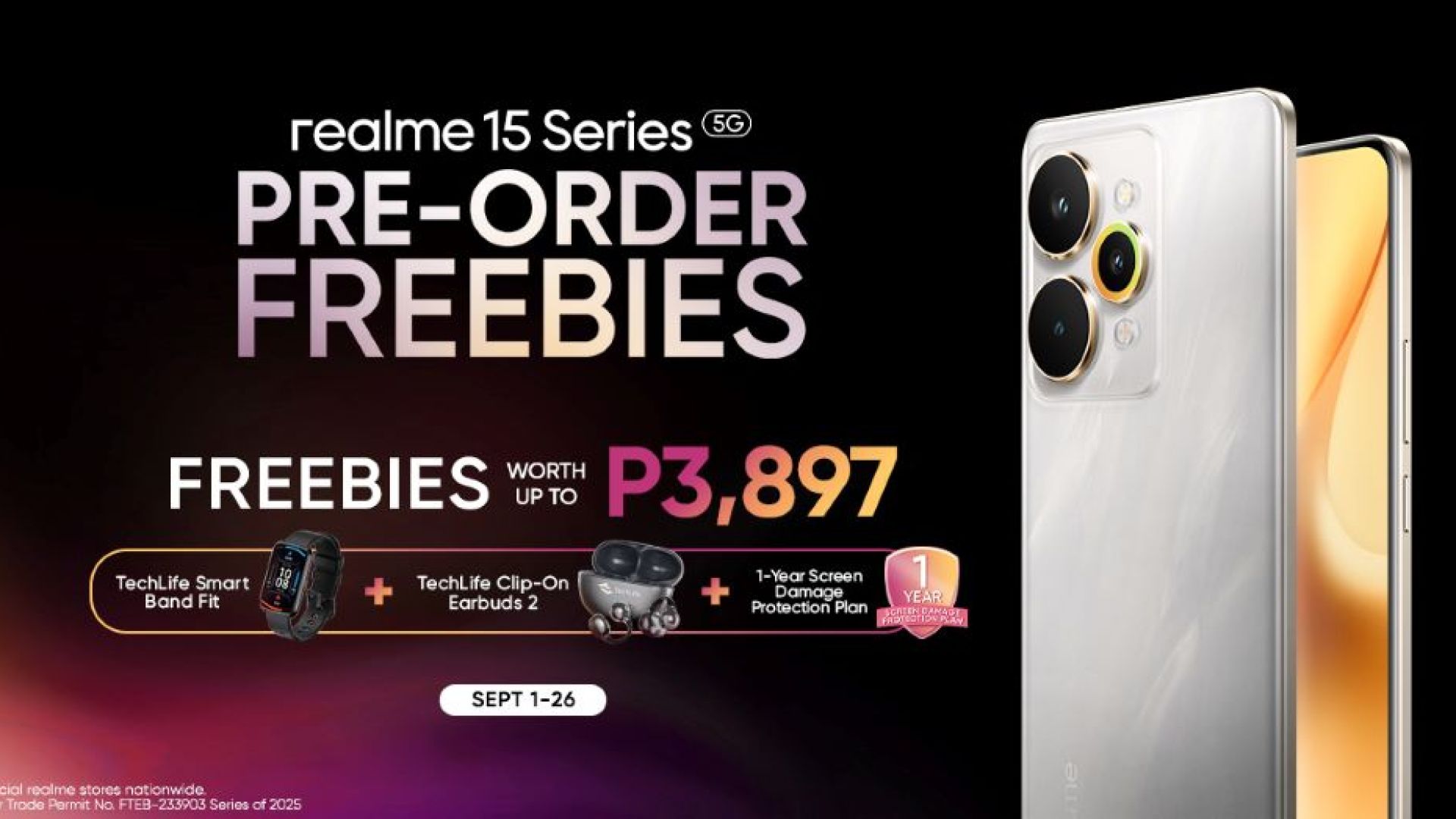 Pre-ordering comes with exciting freebies worth up to P3,897, including a TechLife Smart Band Fit, TechLife Clip-On Earbuds 2, and a 1-Year Screen Damage Protection Plan, giving fans more value as they upgrade to realme 15 Series 5G.